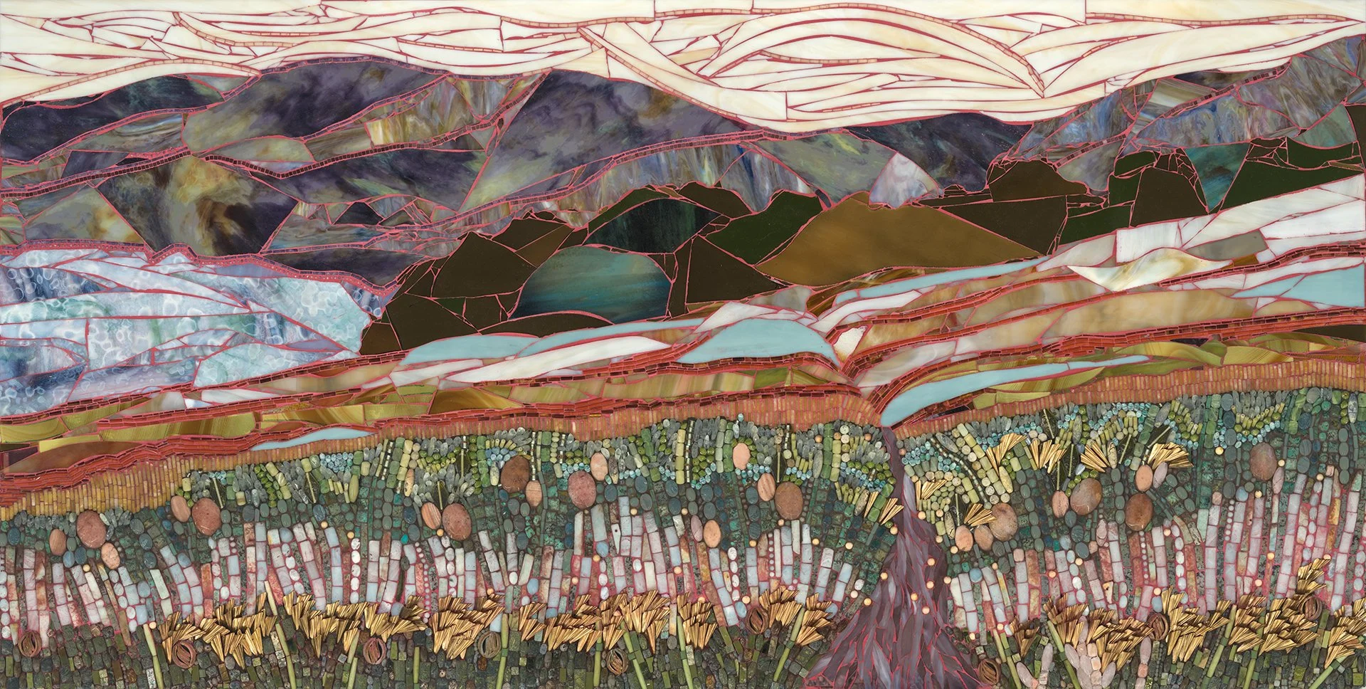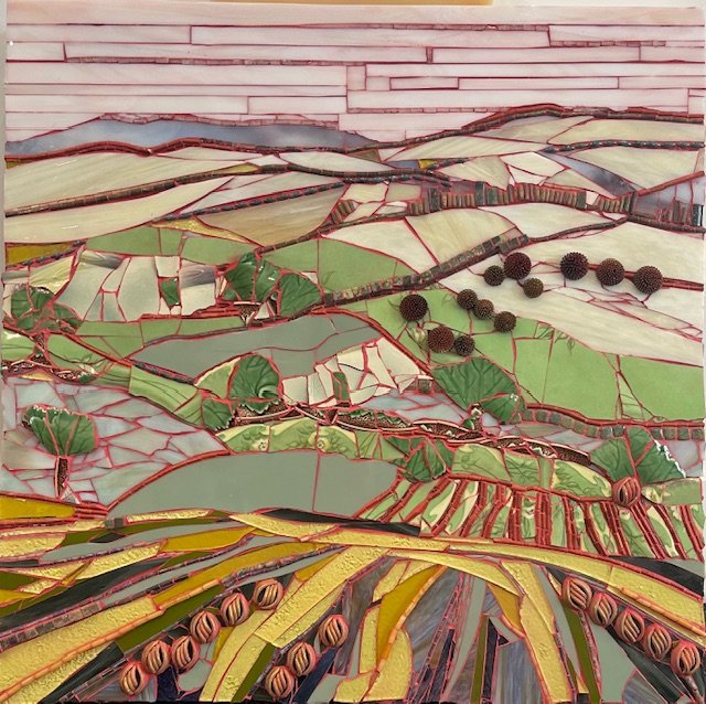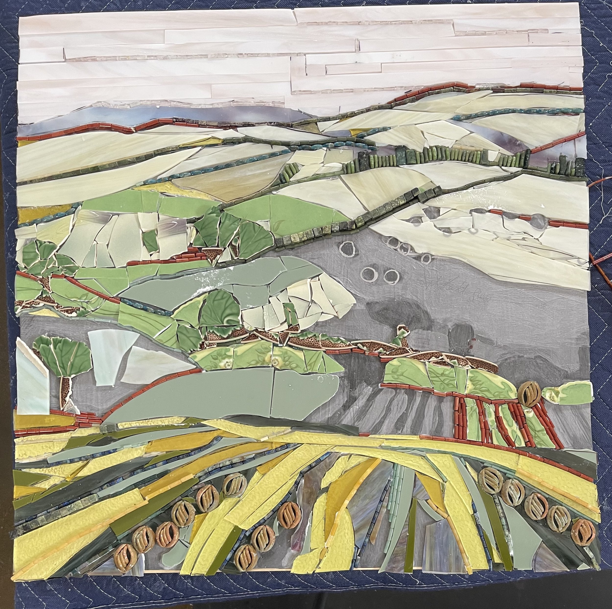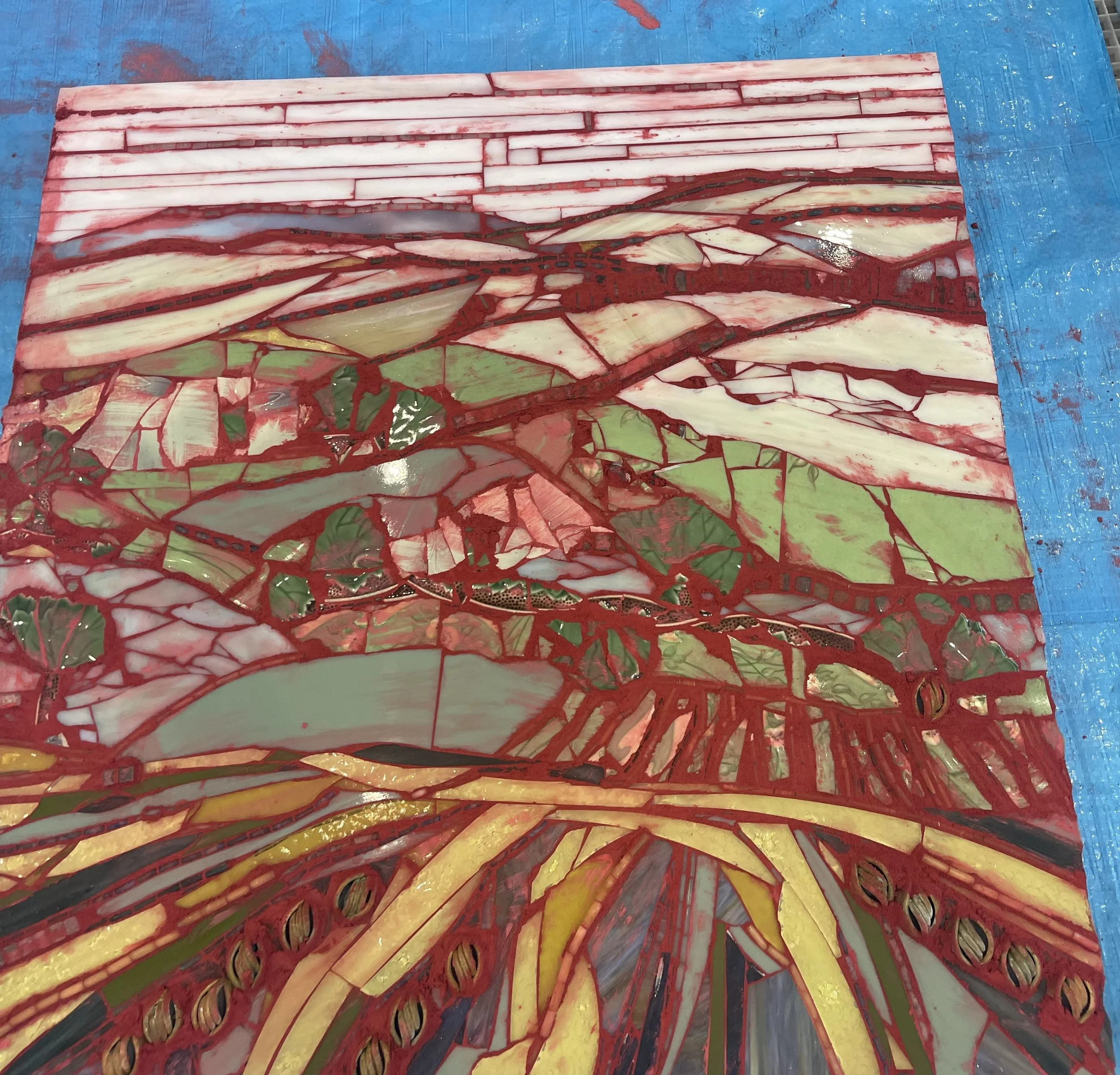 In mosaics, grouting is the last part of the process. I find the grout pulls an entire piece together. My “GO TO” color is a Sable brown. But, knowing that in this piece the grout will be red, I start filling in my landscape with colors that will be complimented with red outlines. The red then becomes an important part of the visual story.